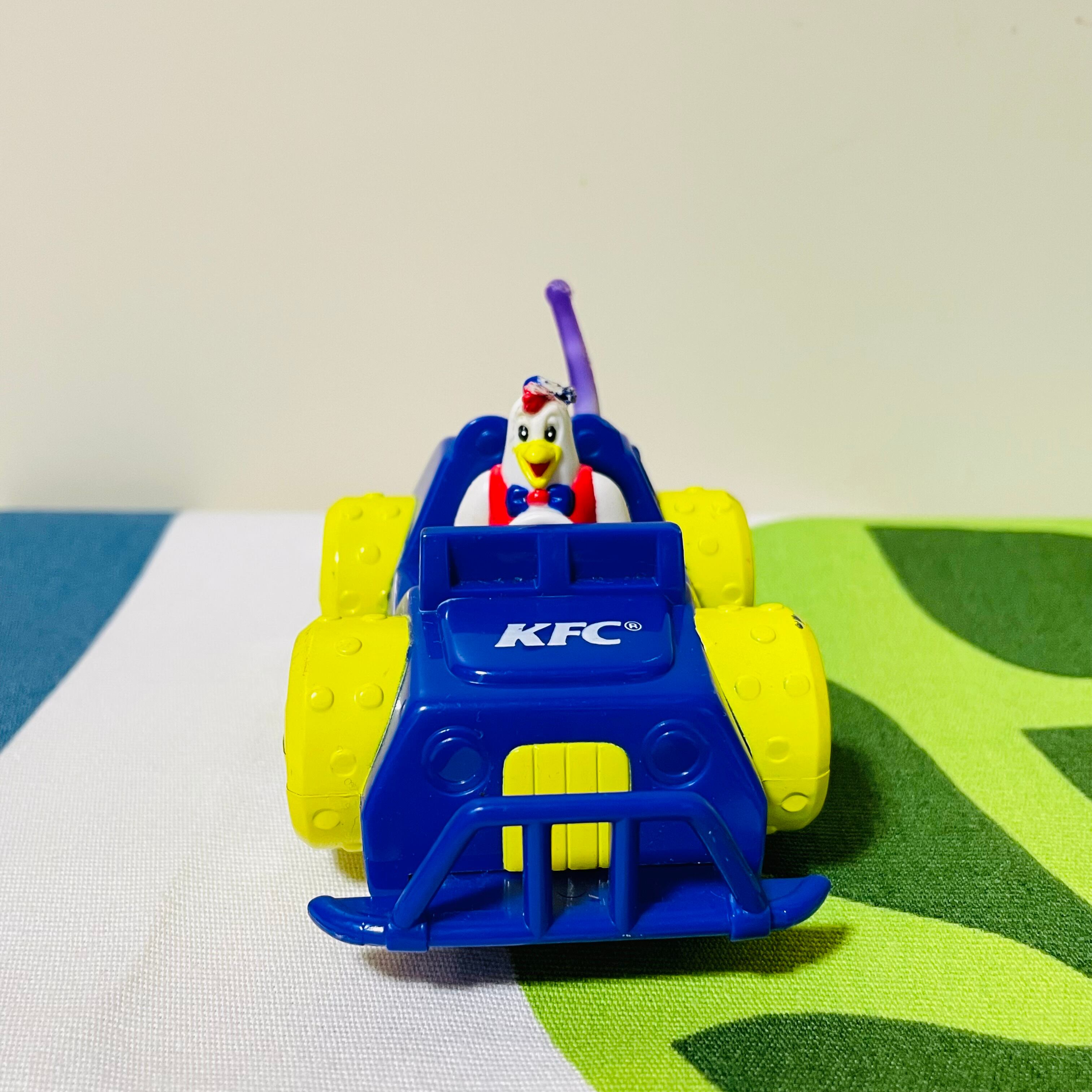 ケンタッキー・フライド・チキンのキッズミールトイより、青い車に乗ったニワトリのチッキー。
