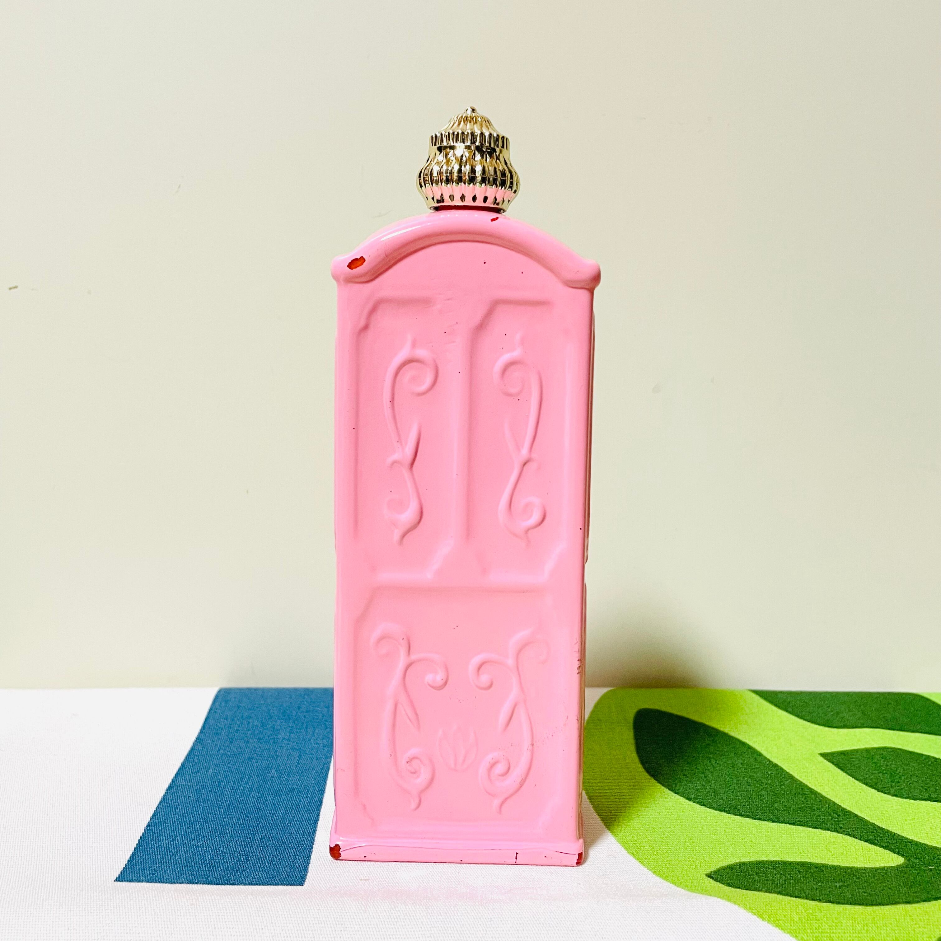 瓶に貼られている紙ラベルには少し黄ばみ、シワがあり、ピンクの塗装が所々ハゲています。瓶自体はヒビ、欠けなどはありません。