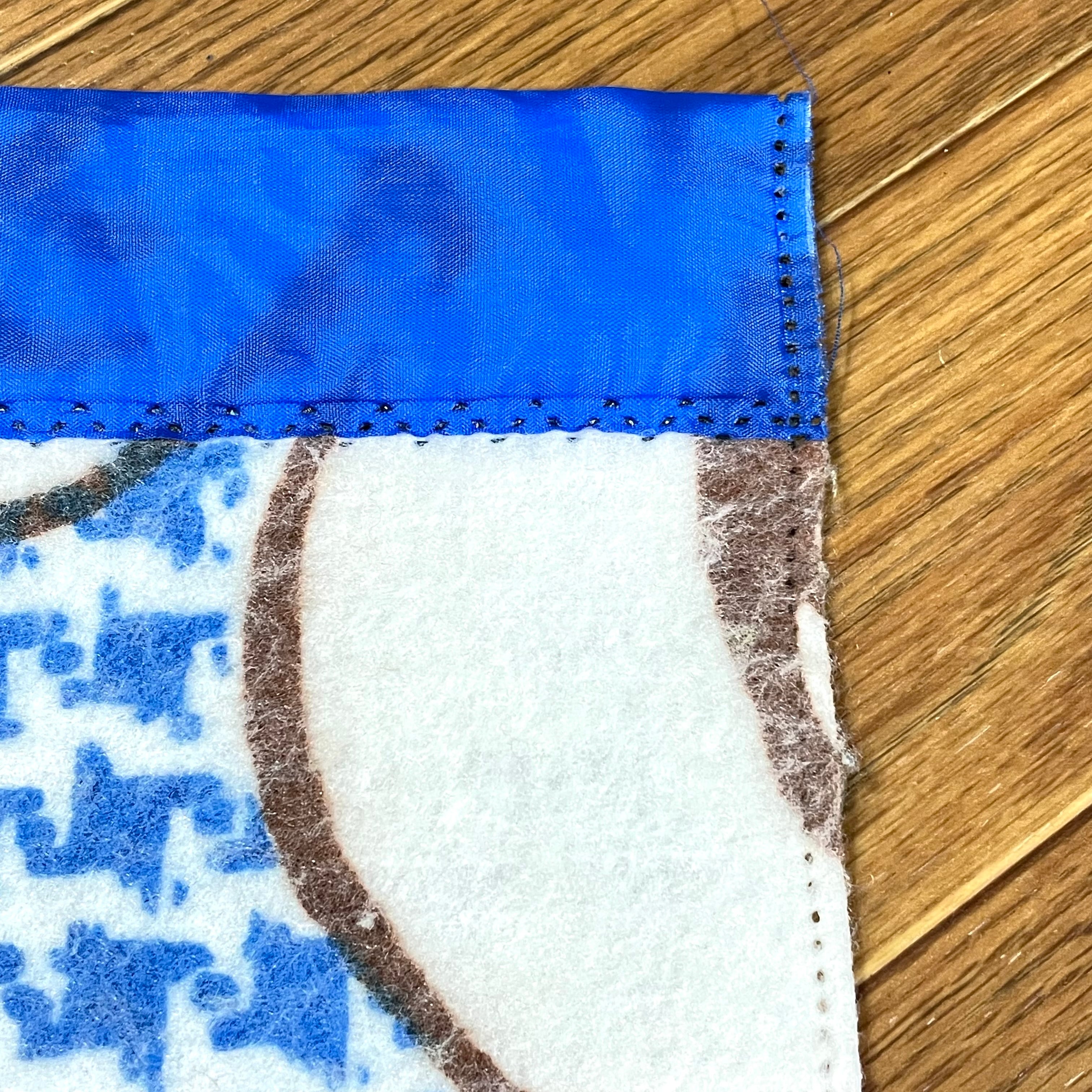 上下がバイアステープで端処理されており、圧着で留められています。
