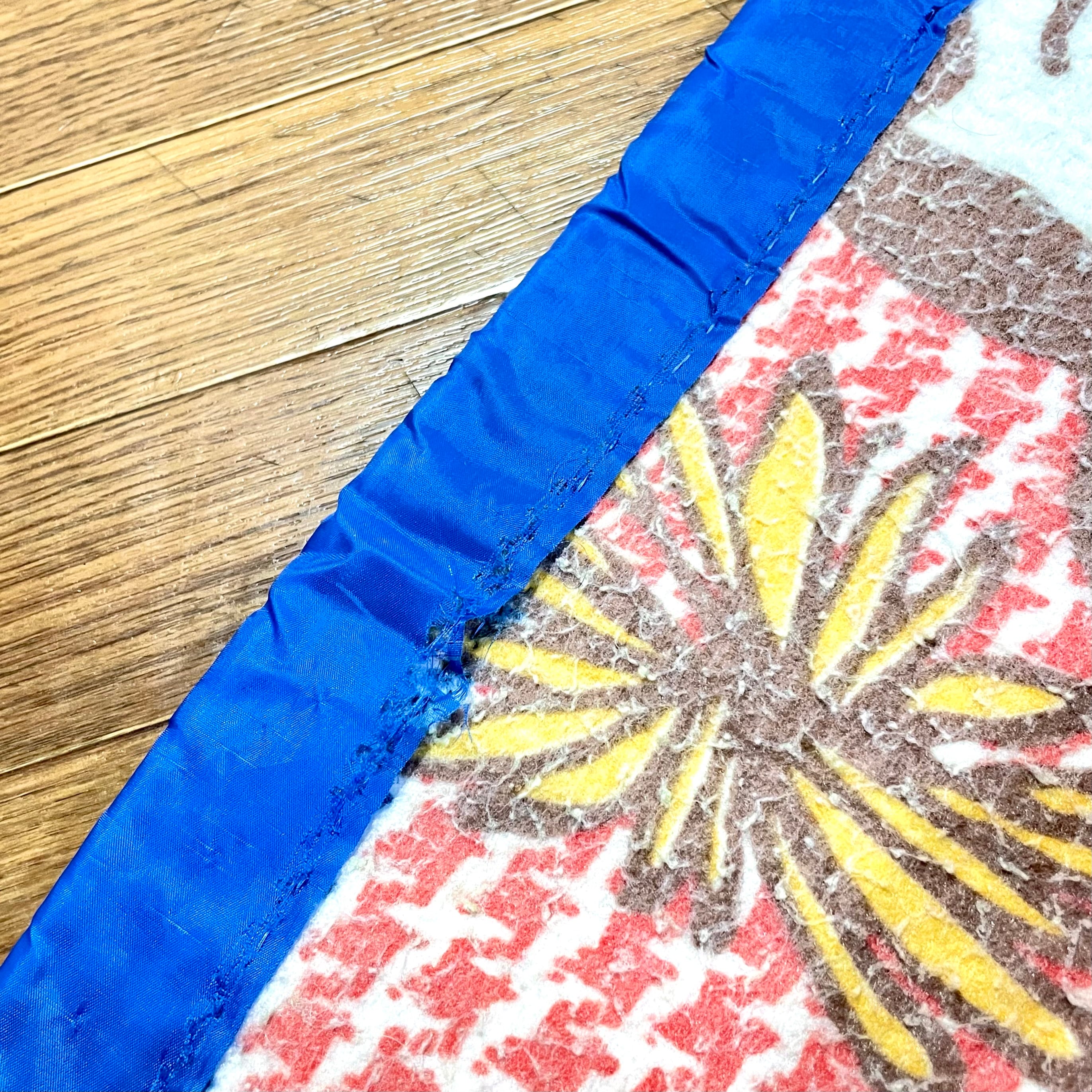 上端に、その圧着が取れてしまって、前の持ち主が手縫いで補修している箇所があります。補修した後にまたバイアステープが破れてしまったような箇所もあります。下端はきれいなまま残っています。