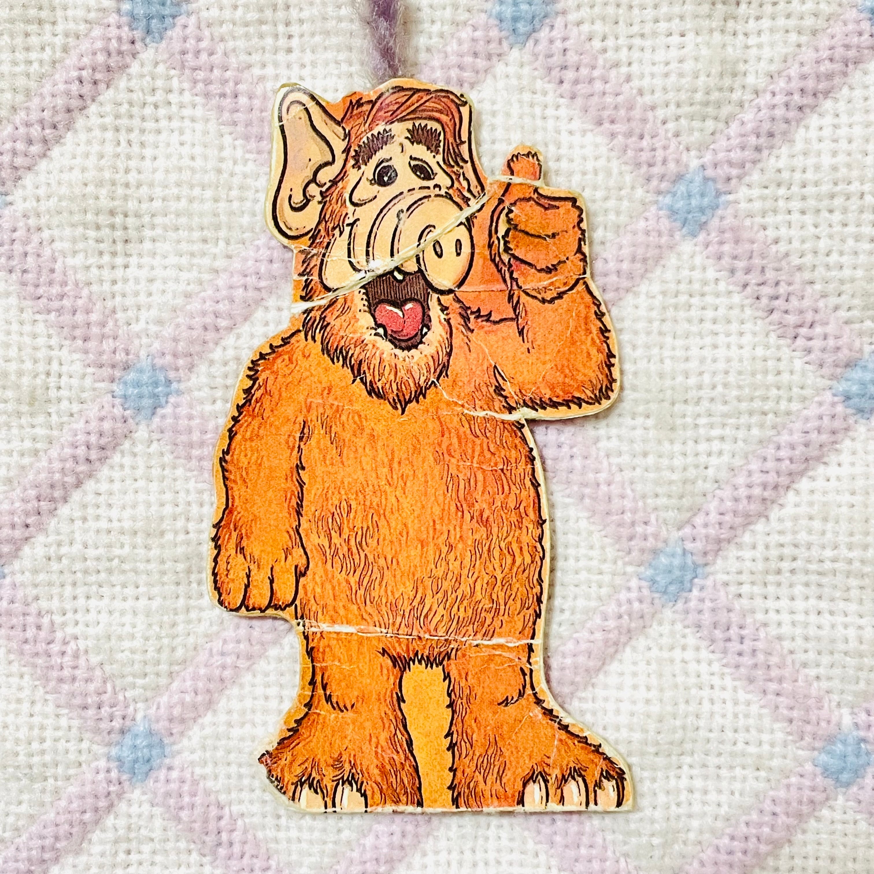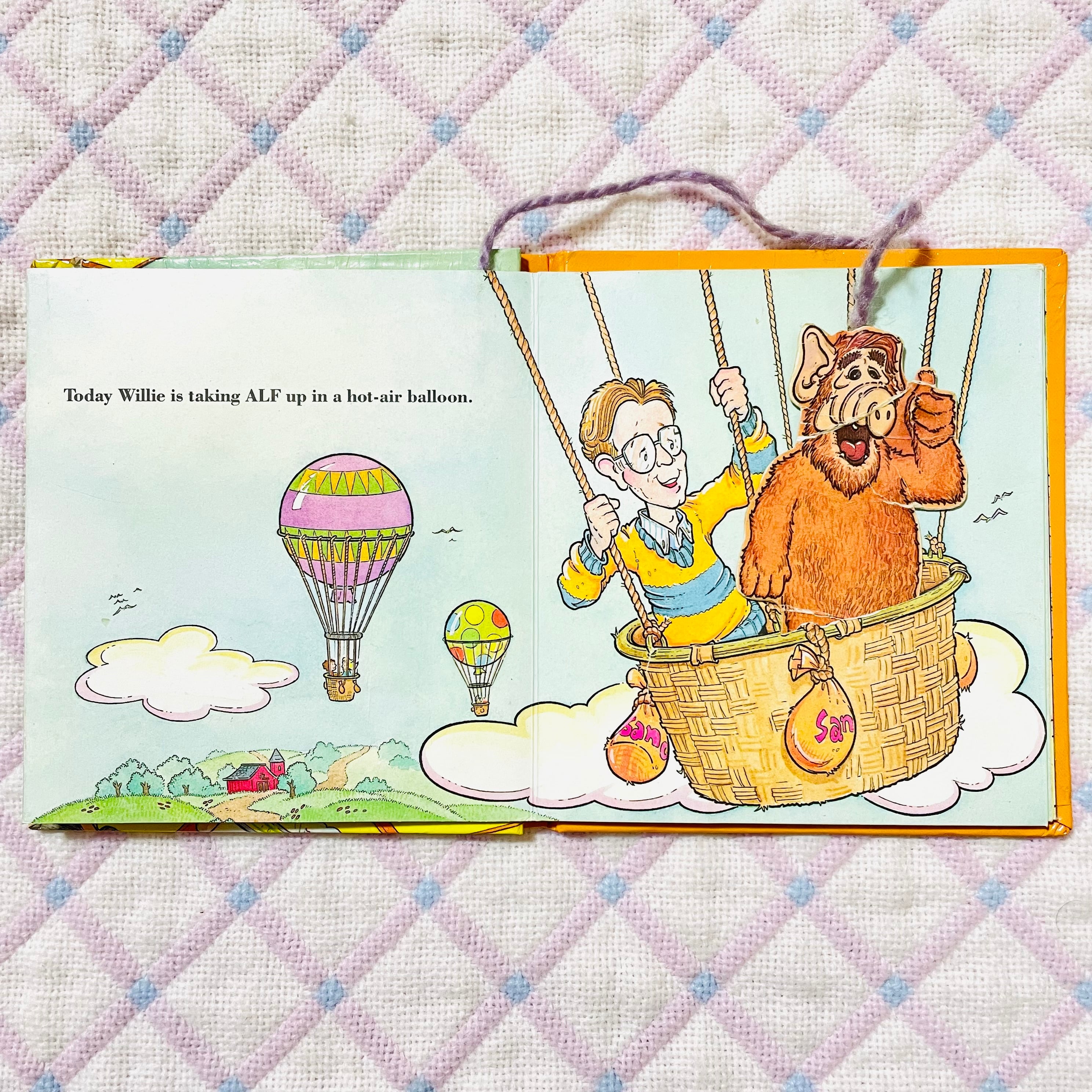 紙製のアルフの人形が付いていて、宇宙船や気球や雲などの各ページの切り込み部分に差し込んで遊びます。