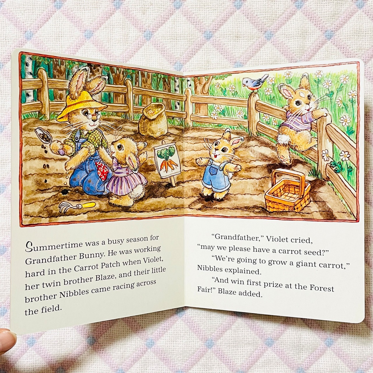 夏の日、おじいさんウサギはニンジン畑の種蒔きで大忙し。子どもウサギたちも収穫祭のコンテストに出す大きなニンジンを作ろうと種を分けてもらいます。