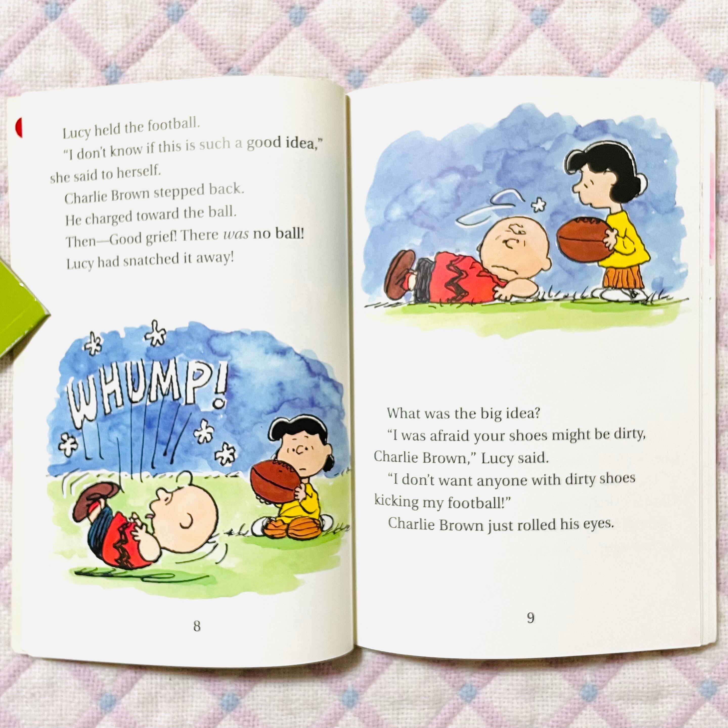 ルーシーが新しいフットボールを手に入れました。チャーリー・ブラウンは蹴らせてもらおうとしますが、意地悪ルーシーは中々蹴らせてくれません。