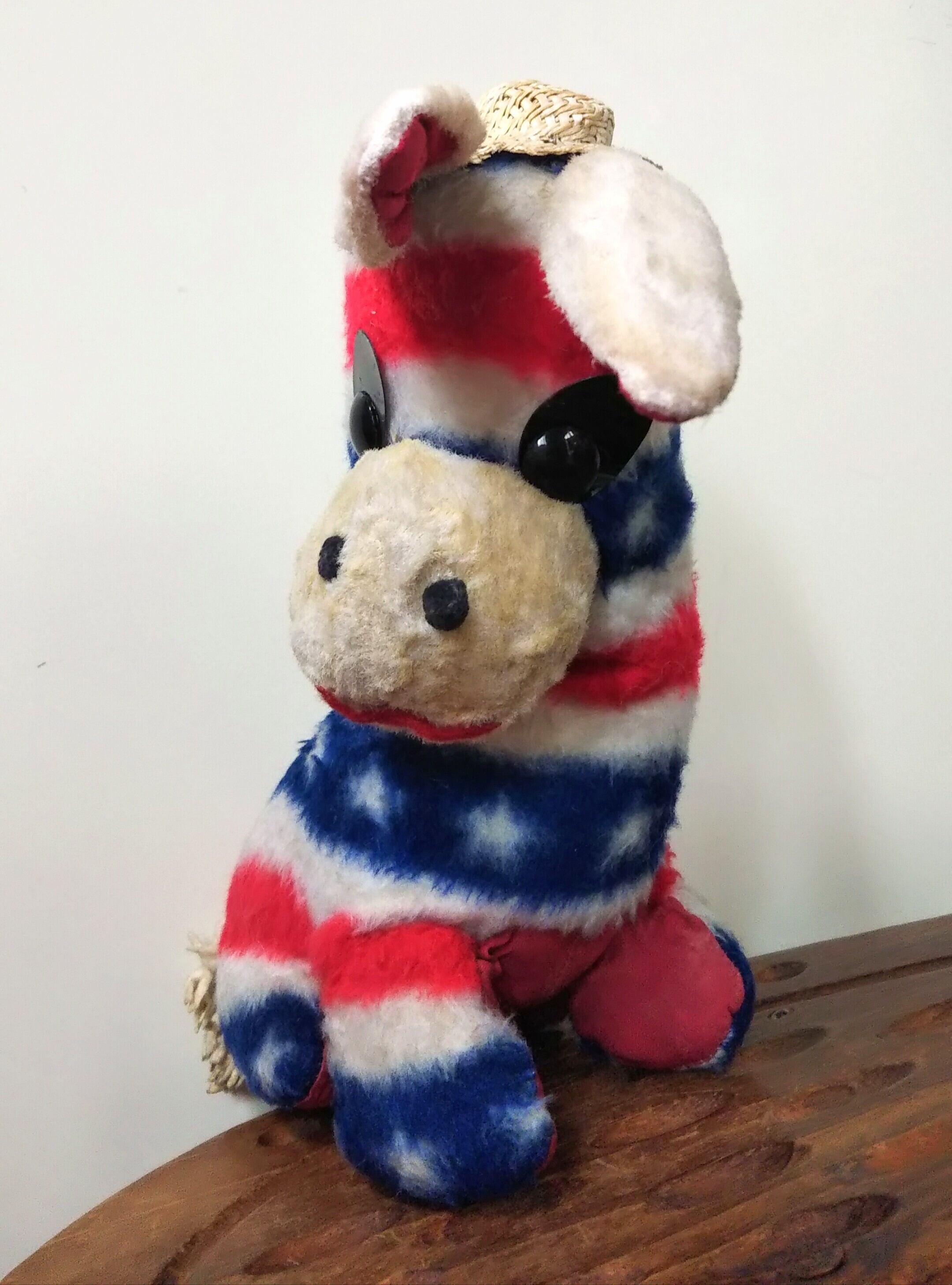 麦わら帽子をかぶった、星条旗柄のロバくんのヴィンテージぬいぐるみ。