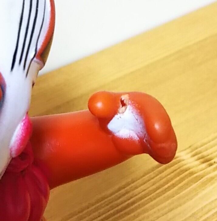 左手に、穴があいています。スプーンでも持たされていたのでしょうか?