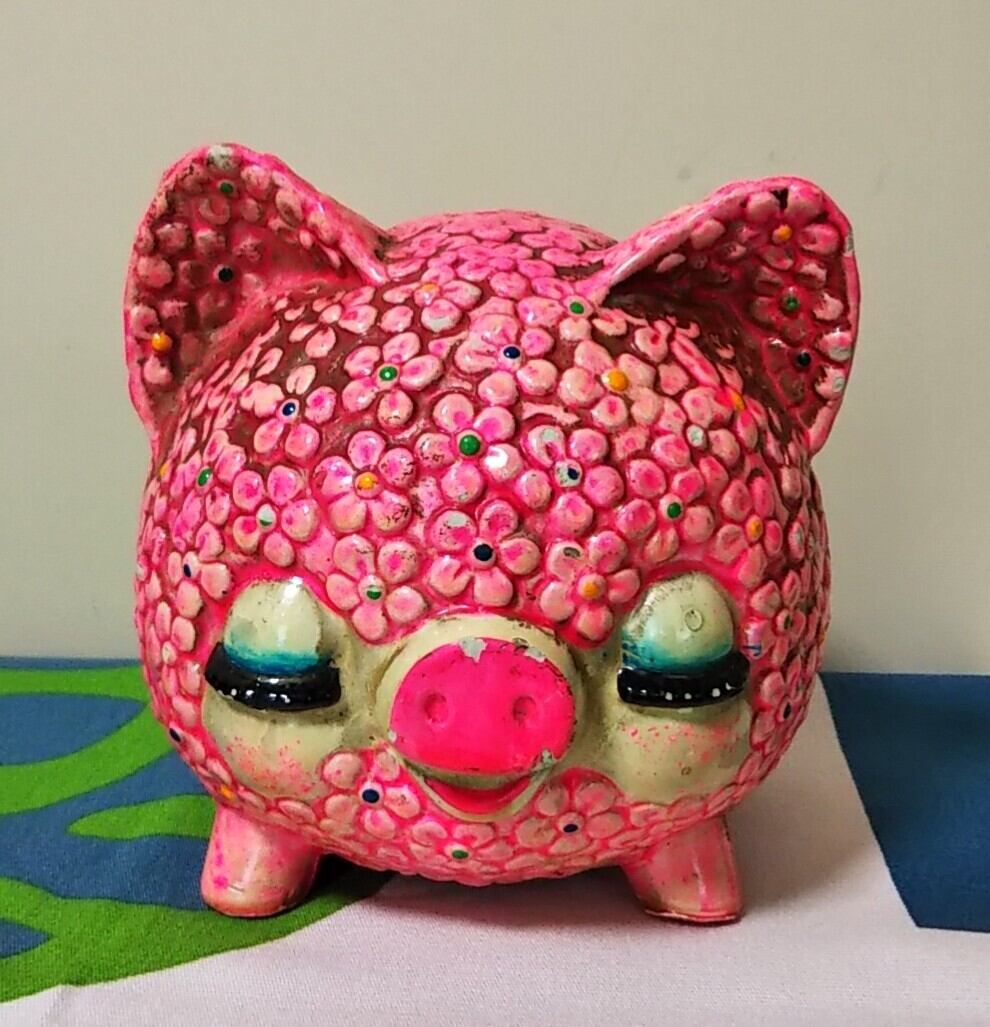 全身花柄が可愛い、ブタさんの貯金箱。
