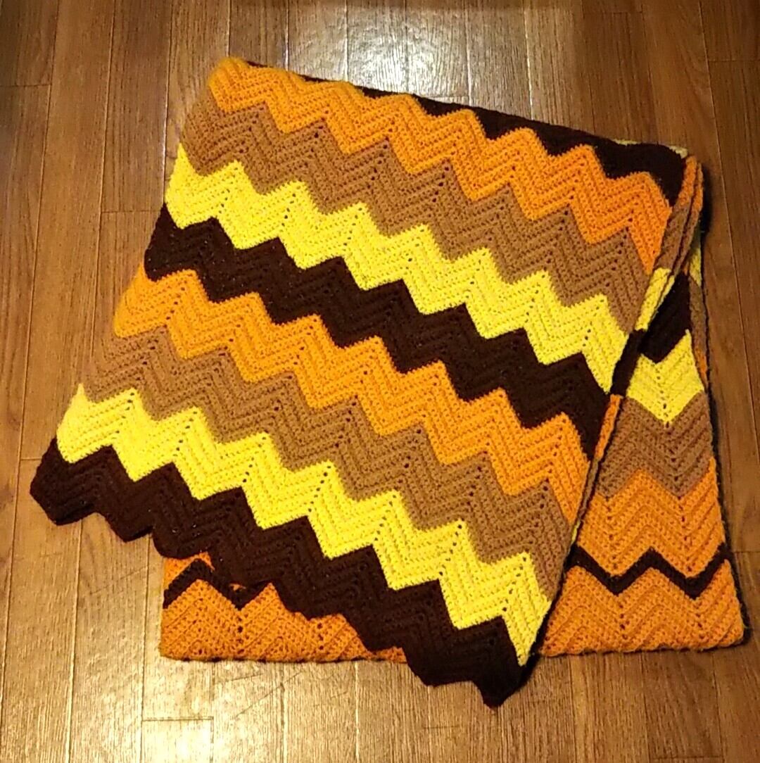 ビンテージ アフガン 手編みブランケット マルチカバー シェブロン柄 ジグザグストライプ 茶×黄色×キャメル×オレンジ ヴィンテージ