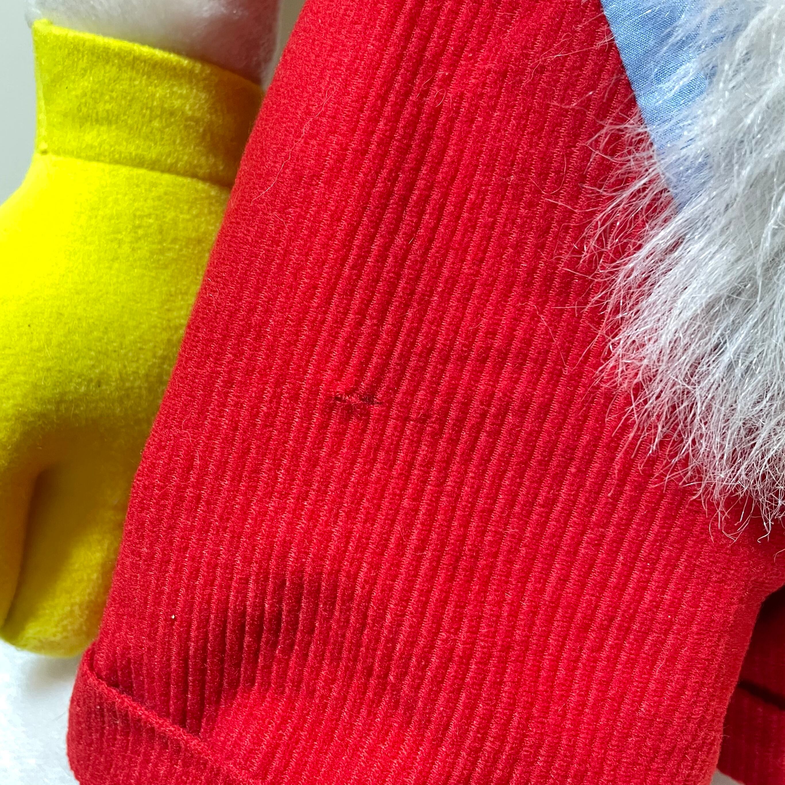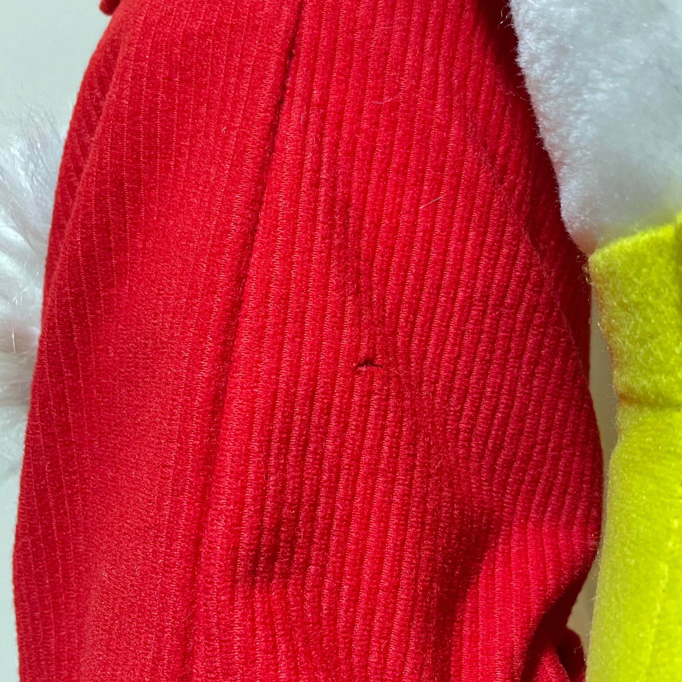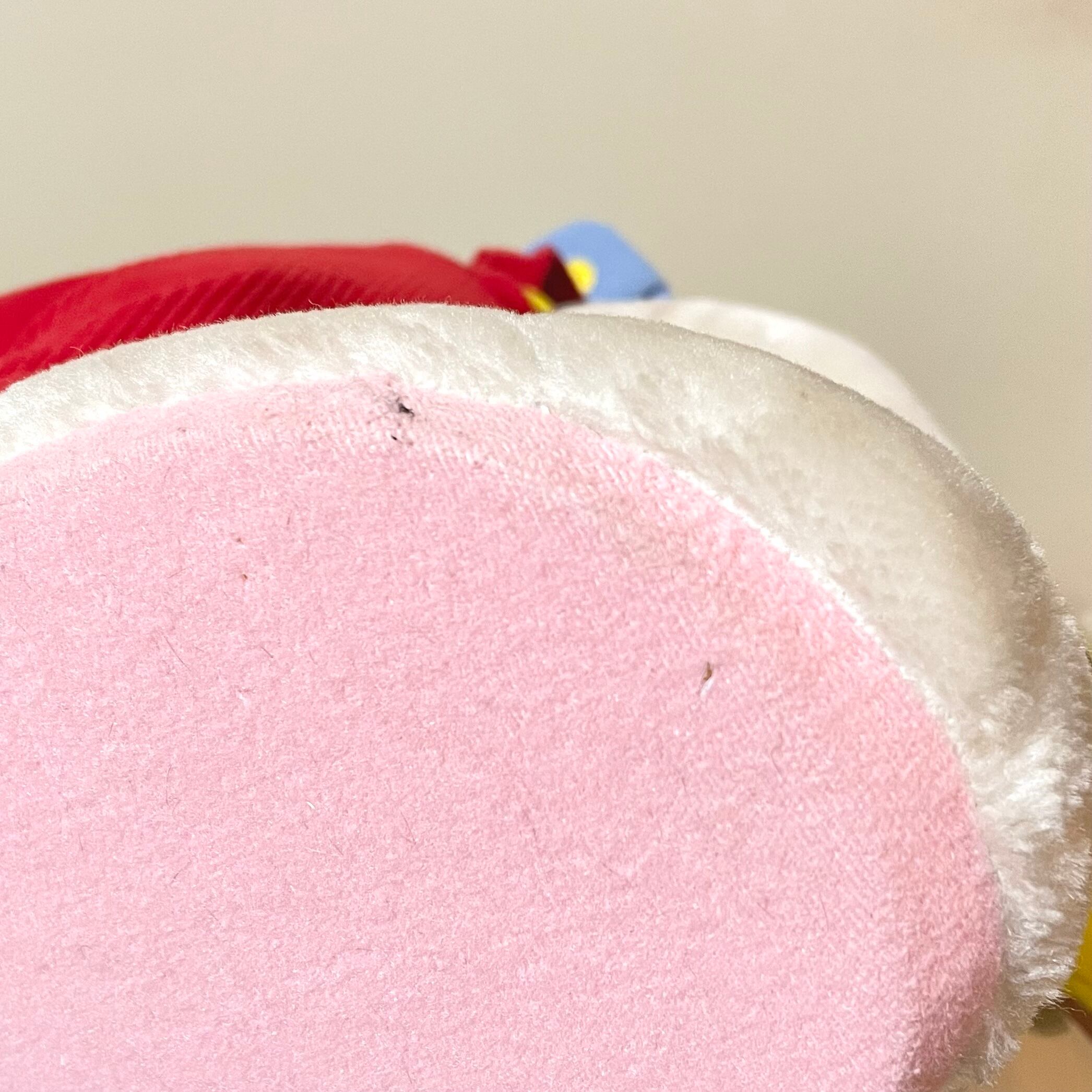 鼻の表面に傷が、左耳にタグ跡のピンホールがあり、洋服と足の裏に小さな破れがあります。