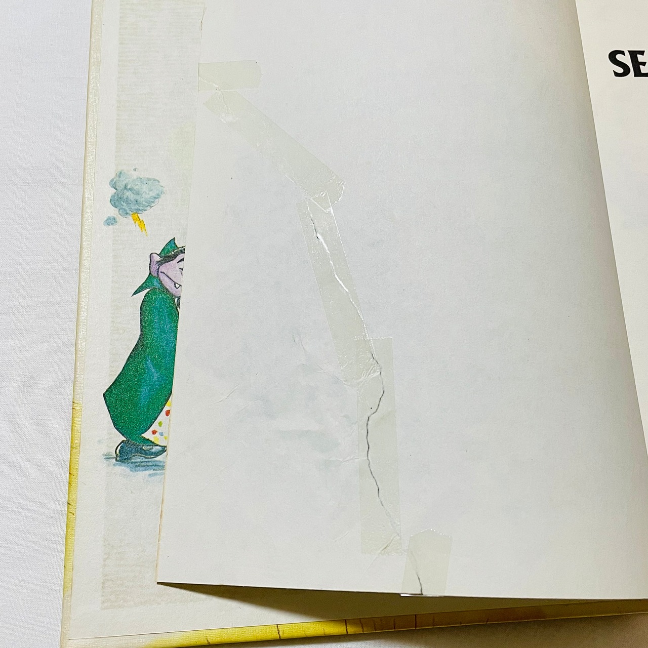 前見返しのページと、途中のひとページに大きな破れがあり、テープで直されています。