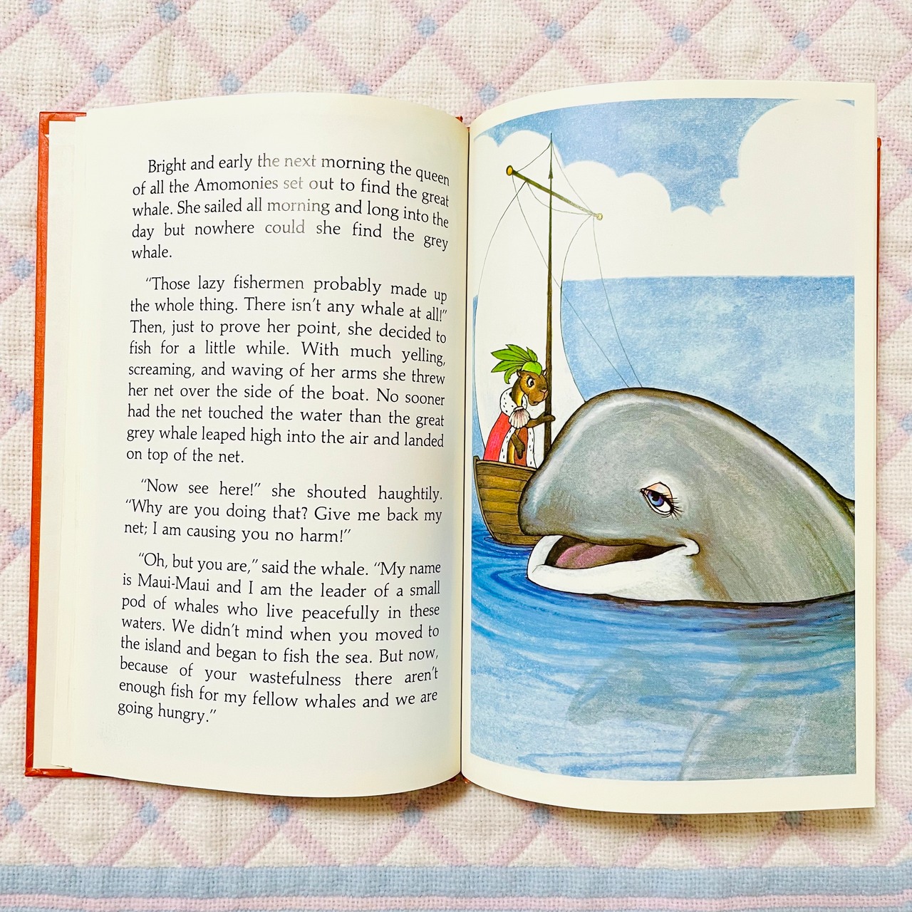 平和だったある島に移住してきたアモモニーズが海の魚を片っ端から捕ってしまうため、クジラたちの食べるものが無くなってしまいます。クジラのリーダーのマウイ・マウイは、その現状をアモモニーズの女王に訴えます。