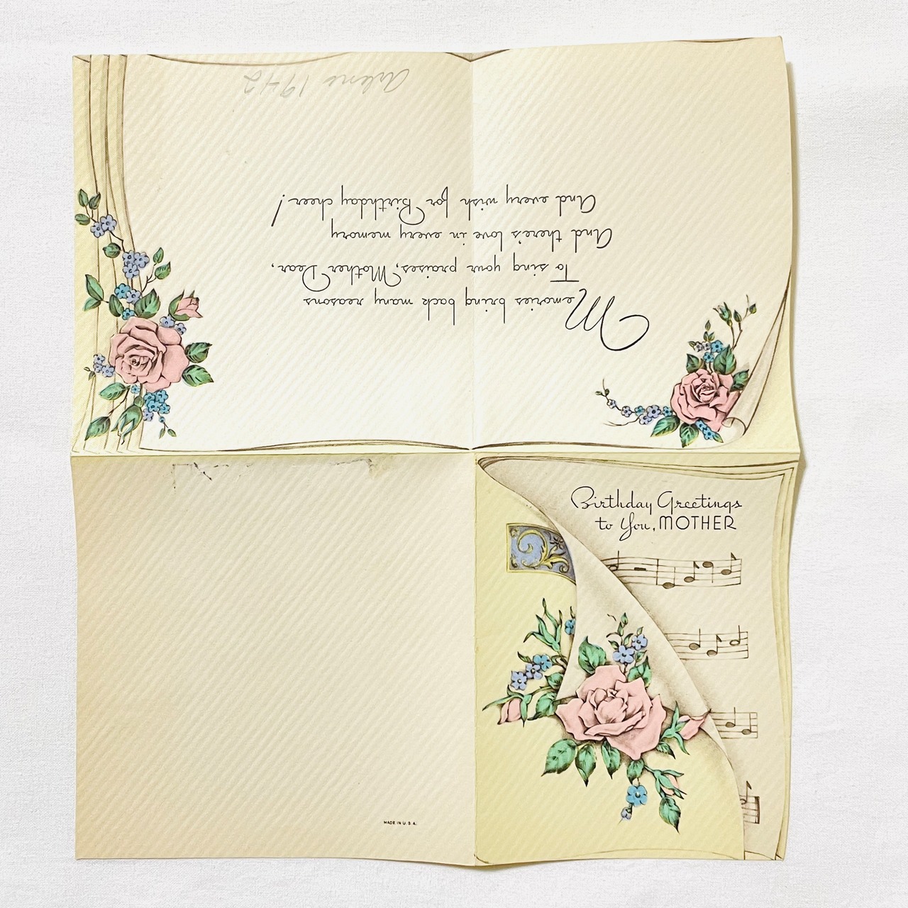 b-100 VINTAGE BIRTHDAY CARD ピンクの薔薇と楽譜 バラの花 バースデイカード 1940年代 GREETING CARD グリーティングカード バースデーカード