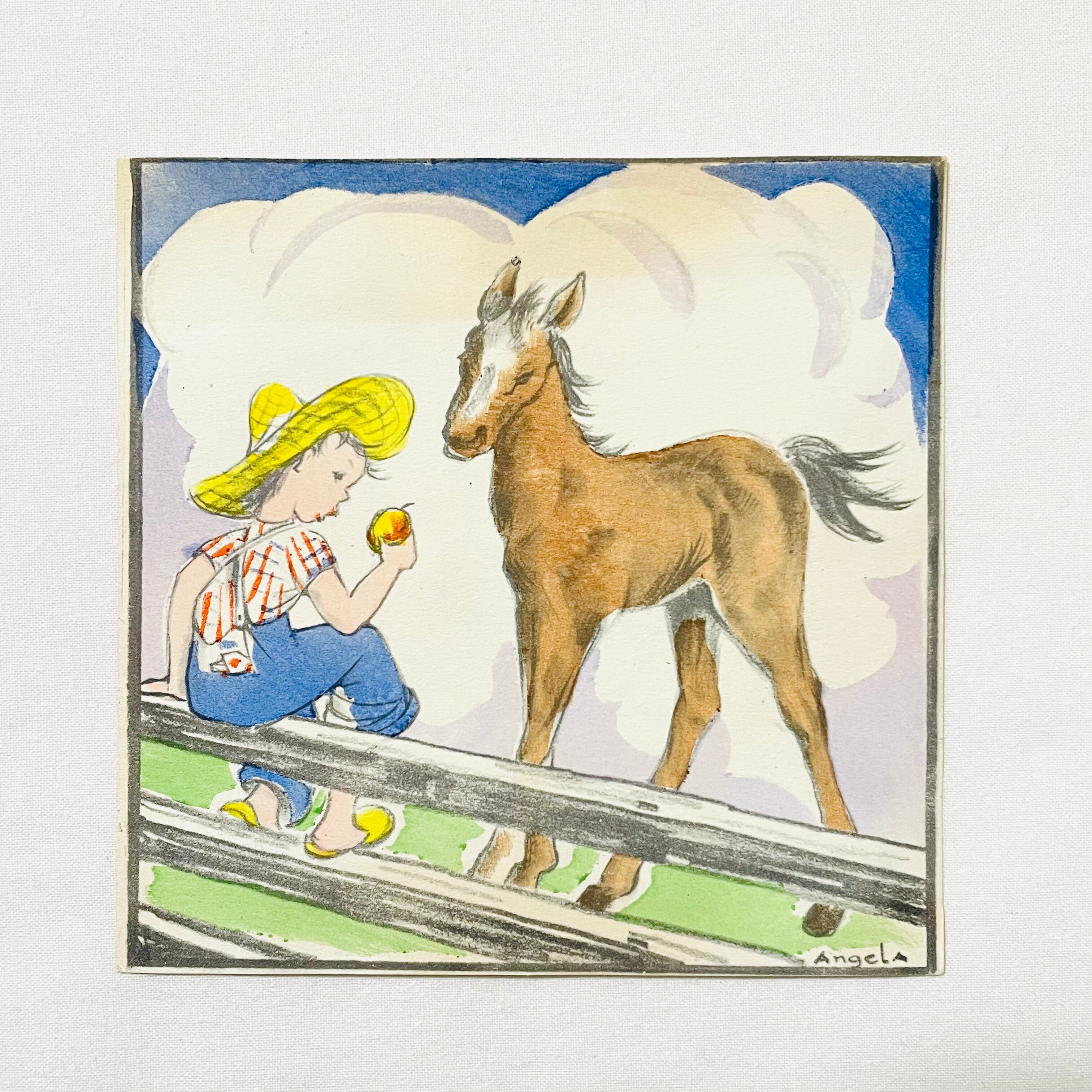 O-11 VINTAGE BEST WISHES CARD リンゴを食べる男の子と馬 ベストウィッシュカード GREETING CARD グリーティングカード